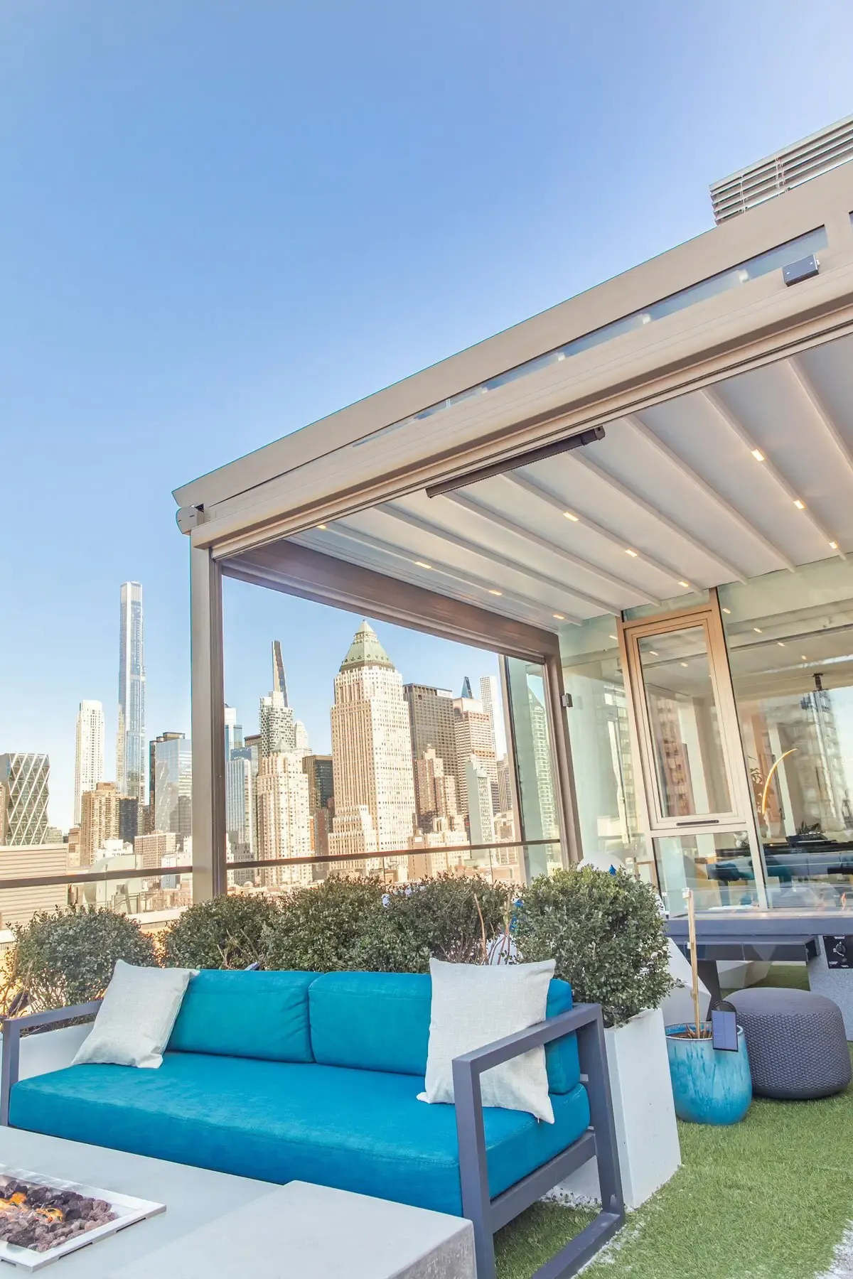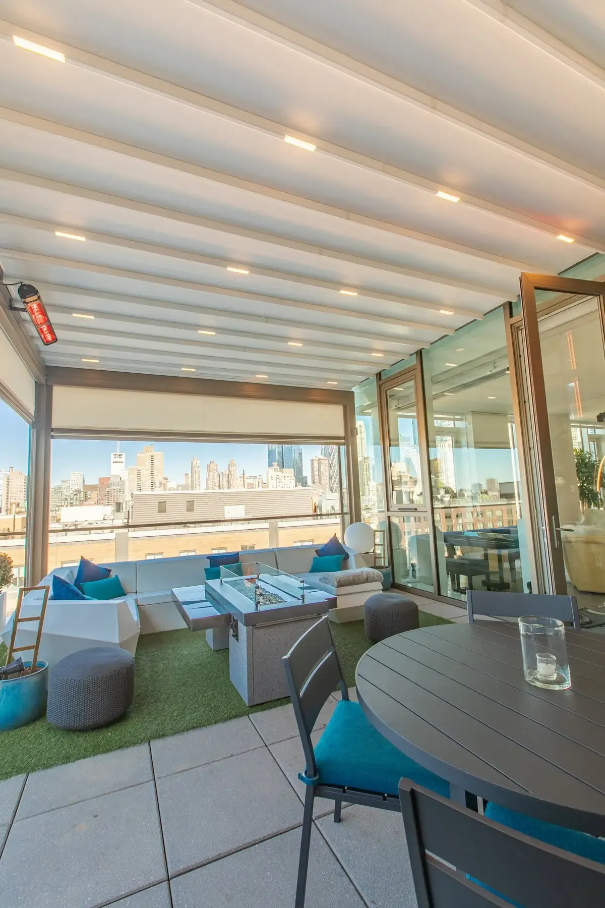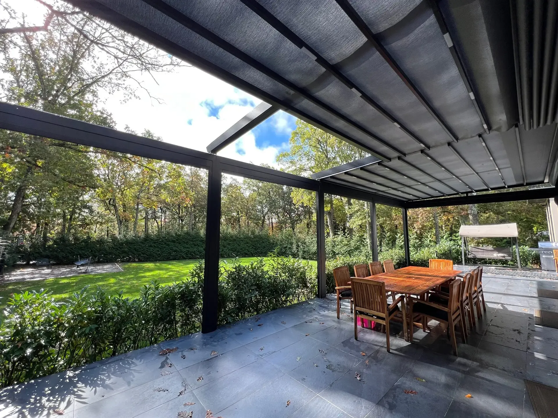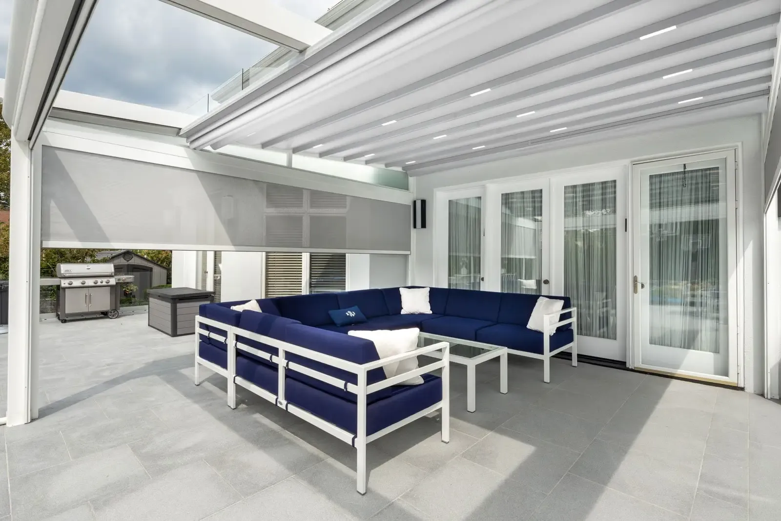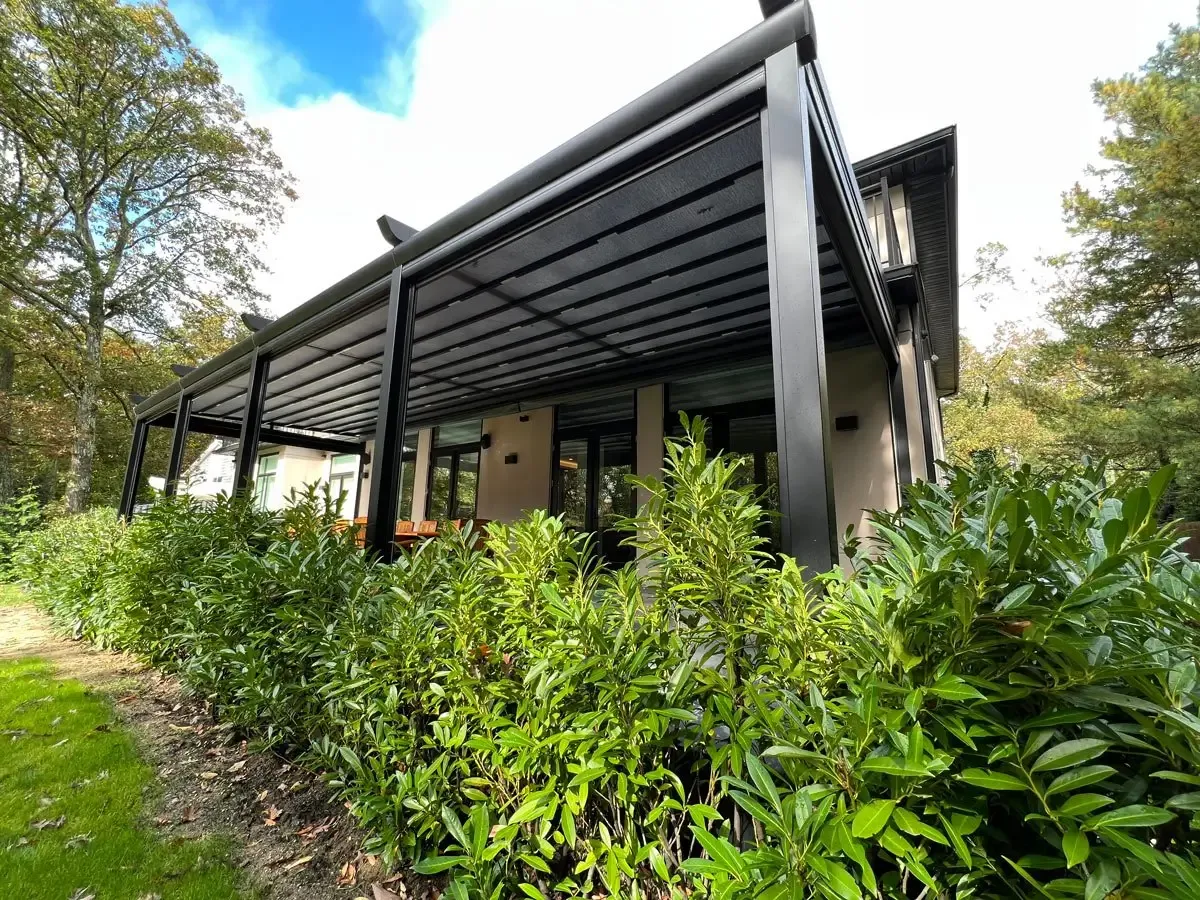 High-end retractable awning with aluminum structure, Pergola Roof offers lasting and aesthetic systems to make use of your patio, terrace, and backyard all year around. It is watertight with built-in gutter and comes with embedded LED lighting.
